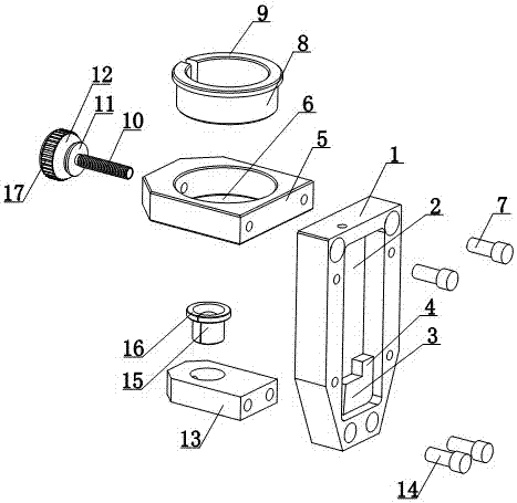 如圖1至圖4所示,一種壓花輥調(diào)試用套裝裝置,包括固定板1,固定板1呈豎直布置;固定板1的上部設(shè)有頂塊5,頂塊5呈水平布置,頂塊5上設(shè)有套裝槽6,頂塊5與固定板1之間設(shè)有第一固定螺栓7,套裝槽6位置設(shè)有套管8,套管8的上部設(shè)有限位環(huán)9,限位環(huán)9設(shè)置在頂塊5上;頂塊5的側(cè)壁設(shè)有鎖柱10,鎖柱10與頂塊5通過螺紋連接,鎖柱10的外端設(shè)有旋帽12,旋帽12與鎖柱10之間設(shè)有旋環(huán)11;固定板1的下部設(shè)有底塊13,底塊13與頂塊5呈平行布置,底塊13與固定板1通過第二固定螺栓14連接;底塊13上設(shè)有固定管15,固定管15的端部設(shè)有定位筒16,定位筒16與套管8對應(yīng);固定板1上設(shè)有開槽2,開槽2的底部設(shè)有卡塊3,卡塊3上設(shè)有凸塊4;旋帽12的外表面上設(shè)有防滑紋17。